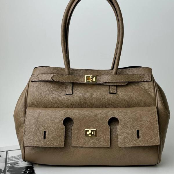 Женская сумочка в уникальном цвете тауп. Модель выполнена настоящим искусством с приятной на ощупь кожи. Внутри одно вместительное отделение. Есть карман на молнии и без. Закрывается полностью на магнитную кнопку. Она еще уникальна тем, что по бокам есть кнопки с помощью которых можно увеличить сумочку и поместить больше необходимых вещей. Фурнитура золотистого цвета и очень крепкая. Модель можно носить как в руках так и на плече.