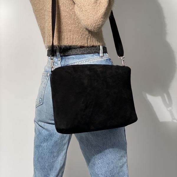 Черная сумка выполнена из качественной натуральной замши. Удобная и вместительная модель сумочки украсит ваш образ. Внутри сумки одно основное отделение, также есть дополнительный ремень.