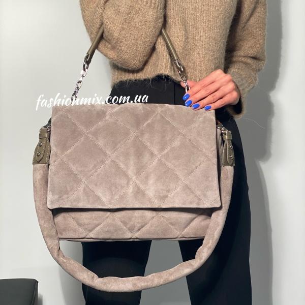 Шикарная и очень стильная модель этого сезона, сумочка из мягкой натуральной замши. Стильная модель из кожи подчеркнет, дополнит и завершит твой образ, сумочка закрывается под клапаном на молнию, есть два дополнительных кармана и одни карман на молнии.
