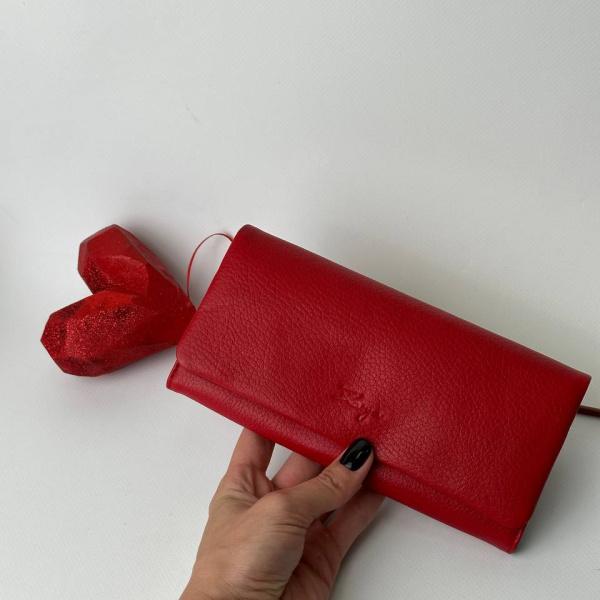 Великий жіночий гаманець виконаний із натуральної шкіри червоного кольору. Ця модель має чотири основні відділення для купюр, також шість відділення для карток, і дуже зручні відділення на блискавці їх можна використовувати для монет. Закривається гаманець за допомогою прихованих магнітів. Гаманець дуже зручний та практичний, нічого зайвого.