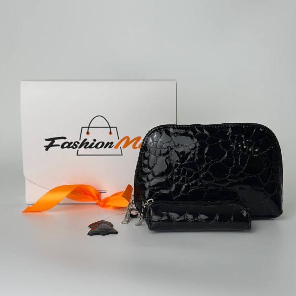 1. Косметичку, лакову чорного кольору. Вона має два місткі відділення, які розділяє кишеню на блискавці. А також усередині є додаткова кишеня на блискавці. Підкладка із щільної та акуратно прошитої тканини. Дуже міцна, якісна, гарного сріблястого кольору фурнітура. Сама шкіра фактурна з гарним витісненням та приємна на дотик за рахунок невеликого наповнення. Дно йде каркасне, щоб косметичка мала привабливий вигляд. Можна використовувати як косметичку або як клатч під сукню. Параметри косметички: 24см*15см*5см.