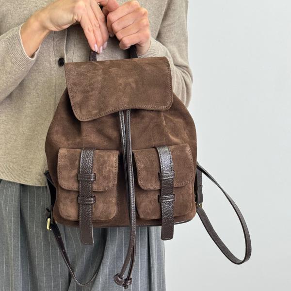 Жіночий рюкзак у глибокому шоколадному кольорі виконаний з натуральної замші та стане зручним і стильним аксесуаром на кожен день. Легка модель приємна на дотик і водночас вирізняється практичністю. Усередині передбачене одне містке основне відділення з додатковими кишенями — на блискавці та відкритою, що дозволяє зручно організувати простір. Попереду розташовані дві оригінальні кишені, які додають виробу особливого шарму. Рюкзак закривається за допомогою міцних затягувань і додатково фіксується клапаном із прихованими магнітами, що забезпечує надійність і акуратний вигляд. Придбати цю стильну та практичну модель ви можете у нашому магазині — чудовий вибір для тих, хто цінує якість, комфорт і сучасний дизайн.