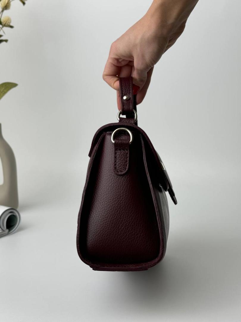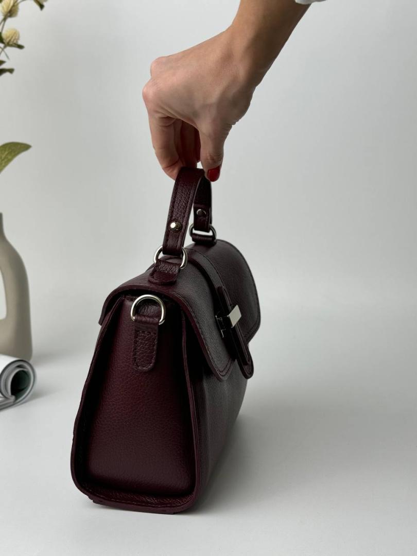 Стильний та практичний варіант на кожен день. Сумочка виконана із зернистої шкіри в кольорі марсала. Усередині два основні відділення, які поділяють кишеню на блискавці. Є додаткова кишеня. Закривається сумочка на блискавку, зверху клапаном на магнітній кнопці. Сумочку можна вільно носити за коротку ручку. І додатково є ремінь, він дозволяє носити сумку на плечі.