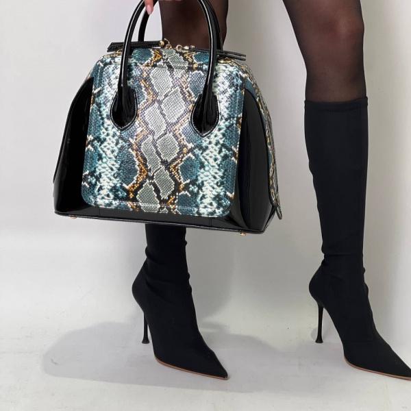 Шикарна модель шкіряної сумочки чорного кольору з принтом продумана до деталей. Дана модель має додатковий ремінь, також можна носити за короткі ручки. Всередині два відділення, кишеня перегородка на блискавці, також є додаткові кишені на блискавці та без блискавки.