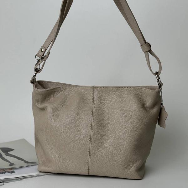 Бежева жіноча сумка виконана з якісної натуральної шкіри м'якої та приємної на дотик. Ця шикарна моделька підійде під будь-яке ваше вбрання. Всередині сумки два основних відділення, також є кишеня на блискавці, яка розділяє сумку, і додаткові кишені на блискавці і без. У комплекті плечовий ремінь, який має два положення.