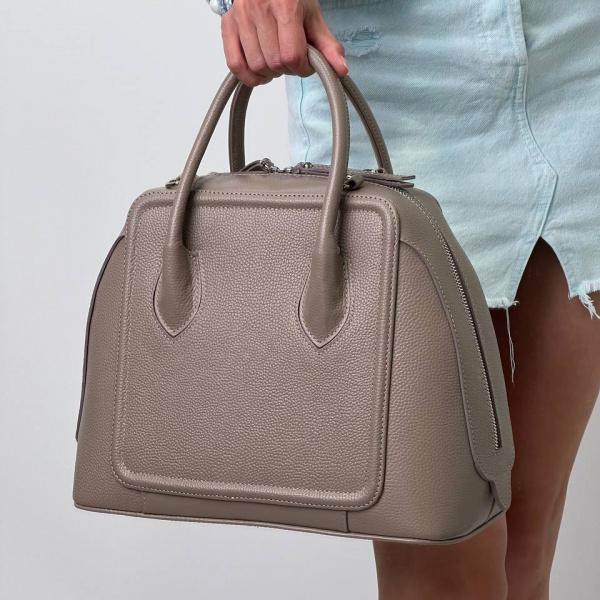 Стильна модель шкіряної сумочки бежевого кольору продумана до деталей. Сумочка має додатковий ремінь, також можна носити за короткі ручки. Всередині два відділення, кишеня перегородка на блискавці, також є додаткові кишені на блискавці та без блискавки.