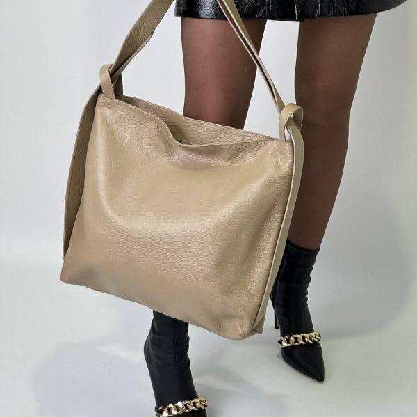 Новинка, сумка з натуральної шкіри бежевого кольору. Всередині одне відділення, які закриваються на блискавку, також є додаткові кишені. Дуже практична та зручна модель сумочки.