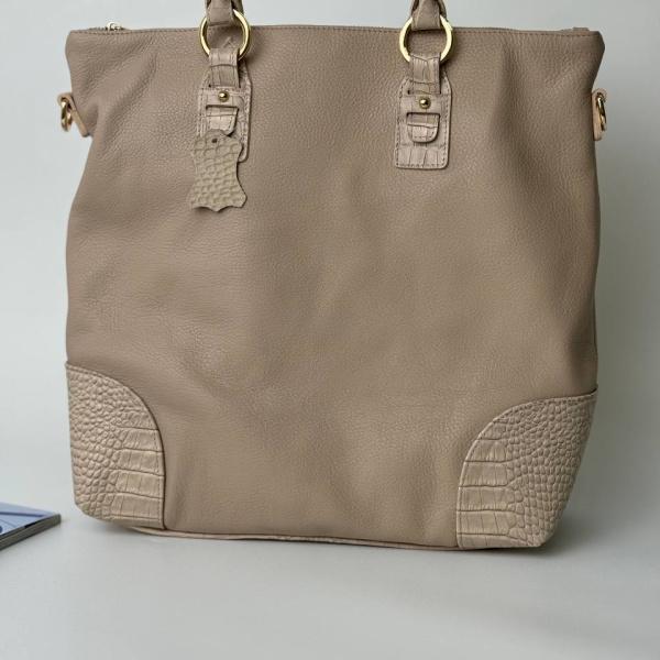 Елегантна та вишукана сумочка з натуральної дуже приємної на дотик шкіри. Сумочка повністю з фактурної шкіри, а ручки та дно сумки виконані з більш твердої шкіри з витісненням, що надає додаткової міцності та вишуканості. Завдяки своєму великому розміру вона легко вміщує формат A4, роблячи її ідеальним супутником як для офісу, так і для ділових поїздок. Стильна та універсальна, ця сумка стане вашим надійним супутником у світі бізнесу та моди.