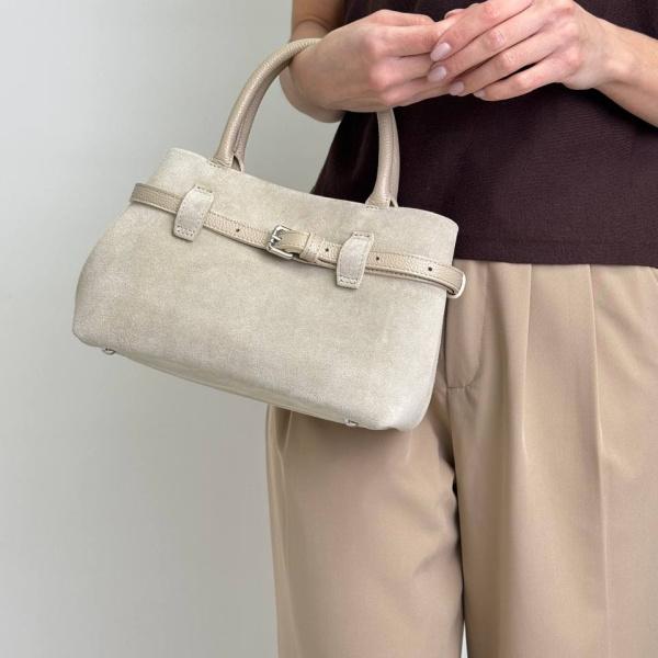Сумочка, яка не залишить байдужою! Стильна жіноча сумка з бежевої натуральної замші в поєднанні з натуральною шкірою - вдале рішення для тих, хто шукає універсальний аксесуар на кожен день. Міні формат, але вражаюча місткість: одне основне відділення, прихована кишеня на блискавці та додаткова без застібки. Закривається модель на надійну магнітну кнопку. Носіть за акуратні ручки або на зручному регульованому ремені - так, як вам комфортно. Якщо бажаєте купити жіночу сумку з натуральної замші й шкіри, що поєднує шикарне якість, зручність і актуальний дизайн - це саме той варіант, який ви шукали!