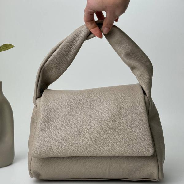 Стильна жіноча сумочка у бежевому кольорі, що має форму з характером. Виконано модель із зернистої натуральної шкіри. Усередині вона має просторе відділення, де є кишені на блискавці і без. Ручка йде м'яка з невеликою палітуркою, що дає моделі якусь родзинку, адже її легко можна конструювати під ваш смак. Додатково мати ремінь, який регулюється на потрібну вам довжину. Закривається модель на блискавку та додатково на клапан із магнітною кнопкою.