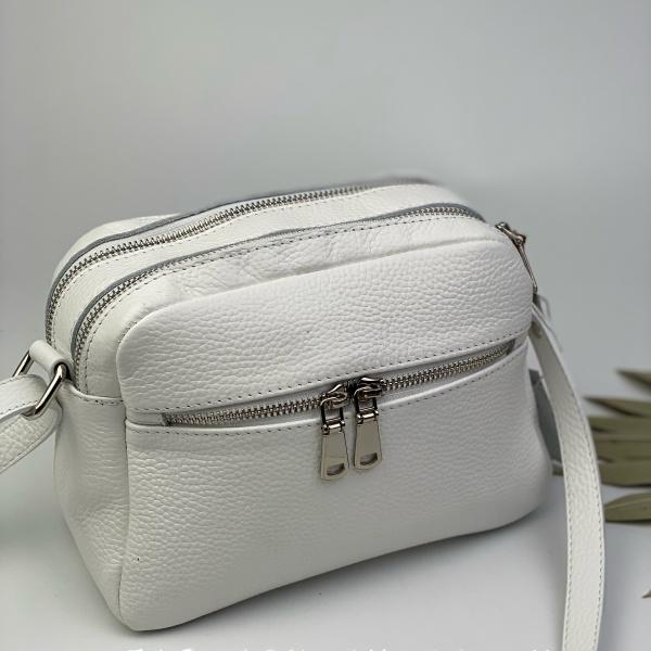 Біла сумка з натуральної шкіри, на перший погляд, може здатися вам маленькою, але не дивлячись на розміри ця красуня вміщує все необхідне для нас дівчат на кожен день. Всередині сумки два відділення, також є додаткові кишені, регульований плечовий ремінь.