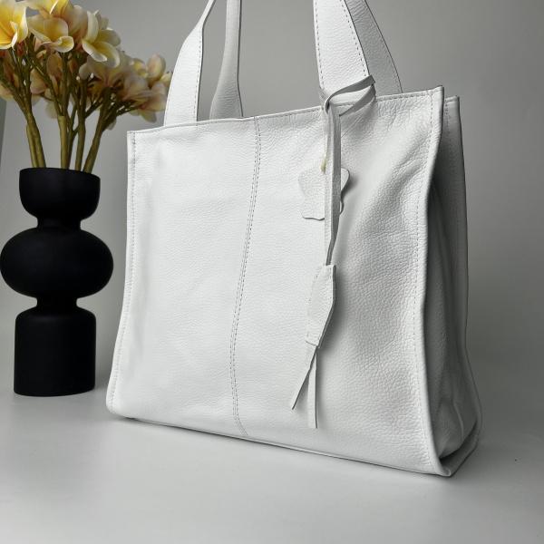 Відмінний вибір сумки білого кольору з натуральної шкіри на кожен день. Сумочка вміщує все потрібне для нас дівчат. Сумка має зручні ручки, тому Ви можете носити її у руці або на плечі. Всередині сумки два основних відділення, також є додаткові кишені на блискавці, який розділяє сумку і додаткові кишені.