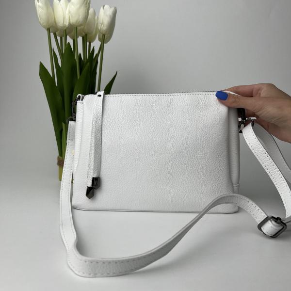 Модна сумочка з натуральної шкіри, не дивлячись на розміри, ця красуня вміщає все необхідне для нас дівчат на кожен день. Всередині сумки три відділення, також є додаткова кишеня на блискавці зі зворотного боку, плечовий ремінь регулюється.
