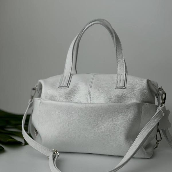 Сумочка з натуральної італійської шкіри білого кольору це безпомилковий варіант, щоб мати все необхідне під рукою. Всередині сумки є два основних відділення, додаткова кишеня на блискавці що поділяє сумку, та додаткові маленькі кишені для дрібних речей. Зручні ручки можна носити як у руках, так і на плечі, вона ідеальна.