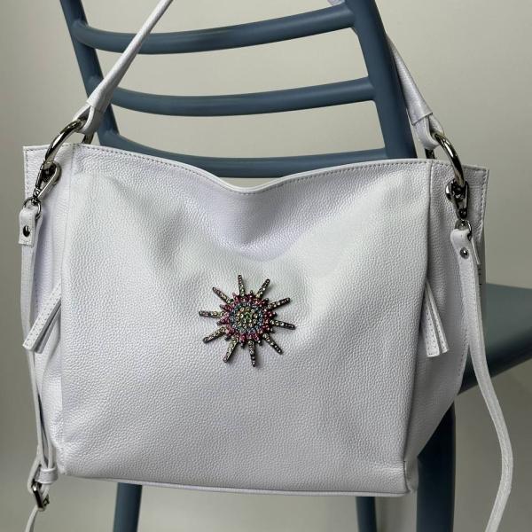 Біла сумка виготовлена з якісної натуральної зернистої шкіри. Ця шикарна моделька підійде під будь-яке ваше вбрання. Всередині сумки два основних відділення, також є кишеня на блискавці яка розділяє сумку та додаткові кишені на блискавці і без блискавки. В комплекті плечовий ремінь, який регулюється.