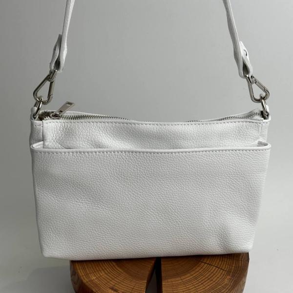 Літня палітра розбавить гардероб! Представлено модель сумочки з натуральної шкіри у яскравому білому кольорі. Дуже практична та невеликого розміру. Є три відділи на блискавках, одне основне та два бокові. Середина виготовлена з якісного текстилю. В комплекті йде також два ремінці: короткий на плечі, і довгий ремінець через плече, який регулюється.