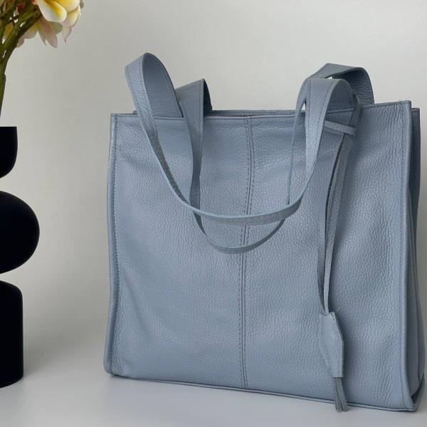 Відмінний вибір сумки блакитного кольору із натуральної шкіри на кожен день. Сумочка вміщує все потрібне для нас дівчат. Сумка має зручні ручки, тому Ви можете носити її у руці або на плечі. Усередині сумки два основних відділення, також є додаткові кишені на блискавці та без блискавки.