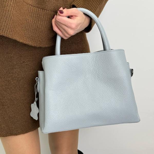 Жіноча сумочка середнього розміру, яка помістити в собі все, що необхідно вам на кожен день. Ніжний блакитний колір приверне багато уваги, а приємна на дотик шкіру принесе задоволення під час носіння. Сумочка має три основні відділення, усередині є кишені. Закривається модель на блискавку та магнітні кнопки. Довжина ременя дозволяє носити сумку як у руках так і на плечі. Вона легка та елегантна.