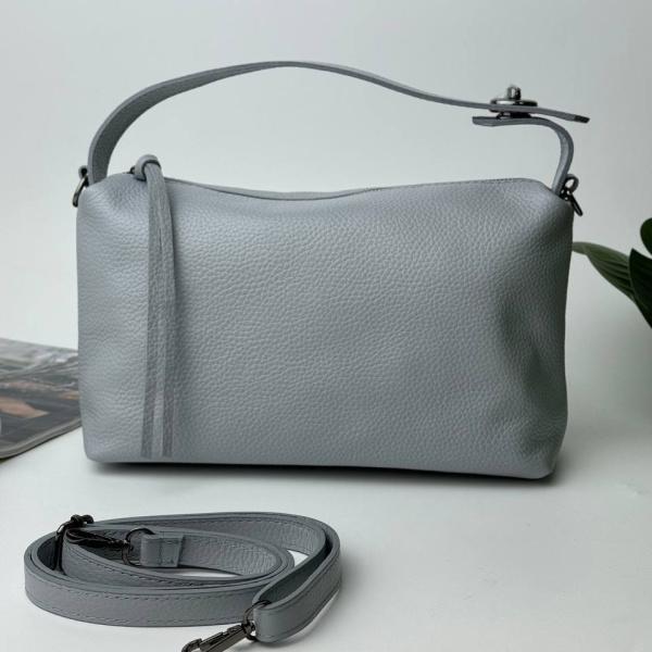 Блакитна жіноча сумочка середнього розміру зможе помістити все, що вам потрібно на кожен день. Усередині сумка має одне основне відділення, а також кишені на блискавці та без. На зовнішній стороні є додаткова кишеня, що дуже зручно. Сумочка має коротку ручку для носіння в руці, а також довгий ремінь, що дозволяє носити її на плечі або через плече.