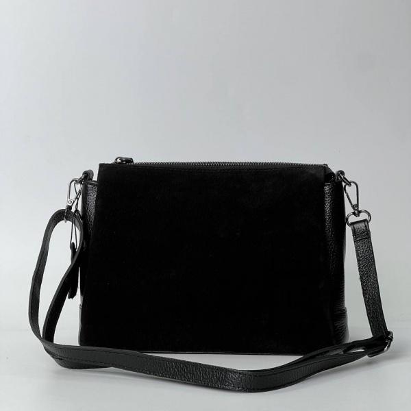 Маленька чоорна сумочка з натуральної шкіри та замші. Не дивлячись на розміри, ця красуня вміщає все необхідне для нас дівчат на кожен день. Всередині сумки три відділення, також є додаткова кишеня на блискавці зі зворотного боку, плечовий ремінь регулюється.