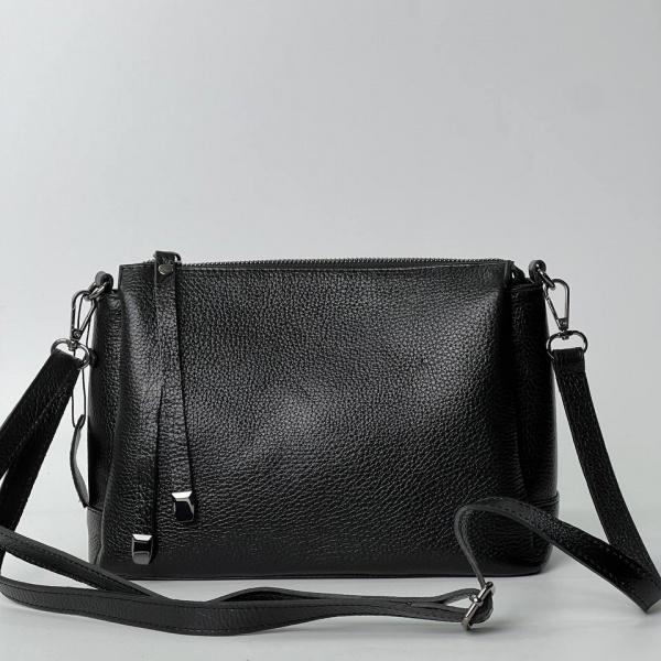 Маленька чорна сумочка з натуральної шкіри. Не дивлячись на розміри, ця красуня вміщає все необхідне для нас дівчат на кожен день. Всередині сумки три відділення, також є додаткова кишеня на блискавці зі зворотного боку, плечовий ремінь регулюється.