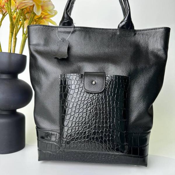 Модна чорна модель з натуральної шкіри класу люкс, вона прикрасить Ваш образ. Сумка має зручні ручки, тому Ви можете носити її в руці, також можна носити на плечі в комплекті плечовий ремінь. Всередині сумки два основних відділення та додаткові кишеню на блискавці, що їх розділяє, також є додатковий кишені на блискавці та без блискавки. В сумочку чудово входить формат А4, модель дуже містка та дуже ефектна.