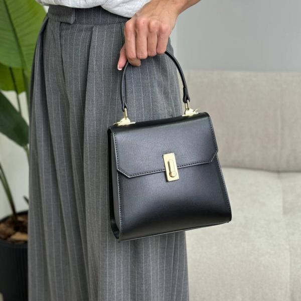 Чорна сумочка з гладкої шкіри, яка підкорить ваше серце. Усередині сумочка має одне основне відділення, а також кишеню на блискавці. Сумочка має нестандартну форму, але дуже зручну. Вона особлива тим, що всередині вона також шкіряна. Це надає їй красивішого зовнішнього вигляду та стійкого носіння. Фурнітура міцна у золотистому кольорі. Закривається модель повністю на клапан із магнітним замком. Модель вільно можна носити за ручку та додатково є ремінь, який регулюється під необхідну вам довжину.