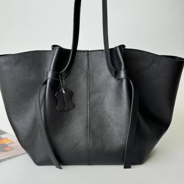 Дуже приємна на дотик і незвичайна сумочка в класичному чорному кольорі з натуральної італійської шкіри. Усередині сумки одне основне відділення, а також додаткова кишеня на блискавці. За рахунок каркасного дна – сумочка стійка. Ручки надзвичайно закріплені за сумку. Це надає їй привабливості та зручності. Адже їх можна дуже красиво відрегулювати та носити вільно як у руках, так і на плечі.