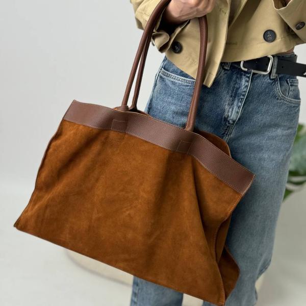 Жіноча сумочка з натуральної замші у чудовому карамельному кольорі. Дана модель має чудове поєднання натуральної італійської шкіри та замші. Сумка має одне велике відділення. Ручки та початок сумки зроблені з натуральної шкіри, а основна частина із замшу. Усередині є одна кишеня на блискавці, яка фіксується на карабіні і яку легко можна зняти. А також у середині сумки є кріплення, що забезпечує тримання форми сумки, а саме замші. Низ йде каркасний, що надає естетичного вигляду та можливість утримувати сумку не змінюючи її задуму. З цією красунею ви завжди будете в центрі уваги і зможете помістити абсолютно все.