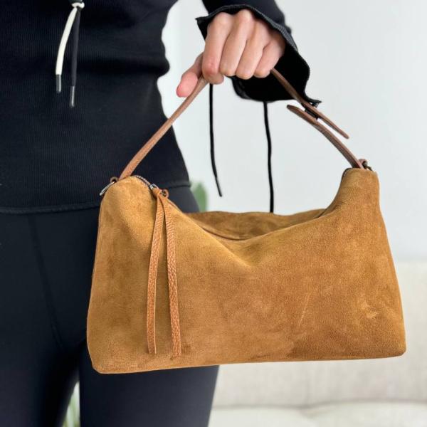 Ваш незамінний та яскравий аксесуар на кожен день. Виконано модель повністю з натуральної замші у карамельному кольорі. Усередині сумки одне основне відділення, а також кишені на блискавці та без блискавки. Зовні також є кишеня на блискавці, що зручно та практично. Закривається повністю на блискавку. Сумочку можна носити за ручку або за ремінь, який регулюється. Модель має дуже приємну на дотик шкіру. Додай свою красуню в образ і вона чудово його прикрасить.