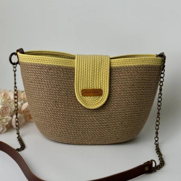 Жіноча сумочка з якісного джгута ручної роботи, яка поєднує в собі два привабливі відтінки - жовтий і світло-коричневий. Це модель з неймовірним поєднанням натуральної шкіри з джутом, прошиті дуже міцною армованою ниткою. Сумочка має одне містке відділення. Носиться модель на ланцюг ремені зі шкіряною вставкою посередині. Шкіряна вставка дуже еластична та легко тримається на плечі. Закривається сумка на клапан посередині сумки з магнітною кнопкою. Це безстрашна модель сумки – вона не боїться ні вологи, ні забруднень. Комфортна як у носінні так і у використанні.