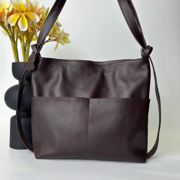 Новинка, сумка з м'якої натуральної шкіри у кольорі марсала, це тренд сезону. Під клапаном одне відділення, які закриваються на блискавку, також є додаткова кишеня на блискавці і без. Сумочку можна носити через плече, дуже практична та зручна модель.