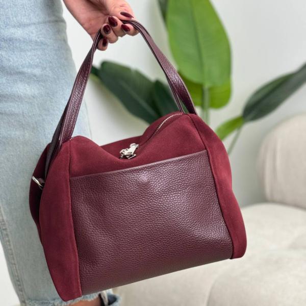 Сумочка у поєднанні шкіри та замші в кольорі марсала, дуже шикарна модель. Модель має одне відділення, які закриваються на блискавку, також є додаткова кишеня на блискавці та без блискавки. Попереду бічні кишені на кнопці-магніт. Сумочку можна носити через плече, дуже зручна та стильна модель.