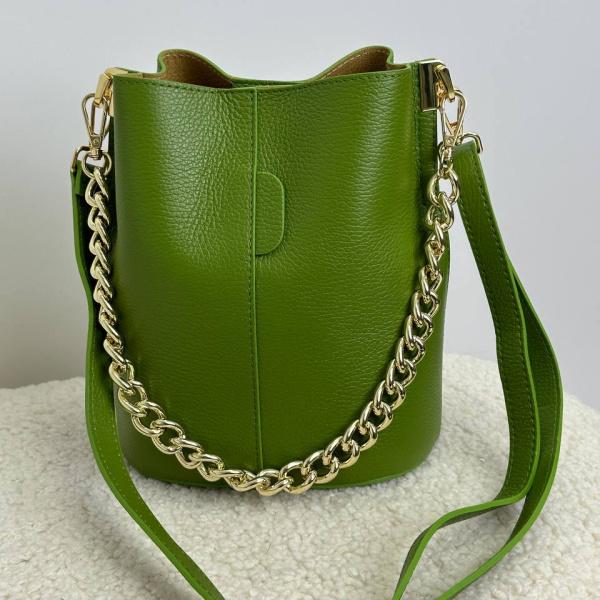 Красива сумка жіноча з натуральної шкіри оливкового кольору. Ніжна шкіра італійських майстрів оброблена з особливою увагою до деталей, вона надає цій моделі неповторної м'якості та вишуканого блиску. Сумочка має два місткі відділення, які поділяє кишеня на блискавці. Закривається вона повністю на міцну магнітну кнопку. Її особливу родзинку підкреслює золотий ланцюжок, що є не просто аксесуаром, це справжній символ стилю, розкоші та вишуканості. Його вільно можна використовувати як і ремінь. Довжина другого ременя, який повністю зі шкіри, регулюється та дозволяє носити сумку так, як вам буде зручно. Ця неймовірна модель підкреслить вашу неповторну красу та витонченість, ставлячи вас у центр уваги на будь-якому заході.