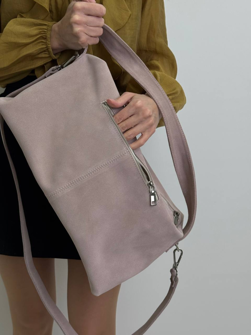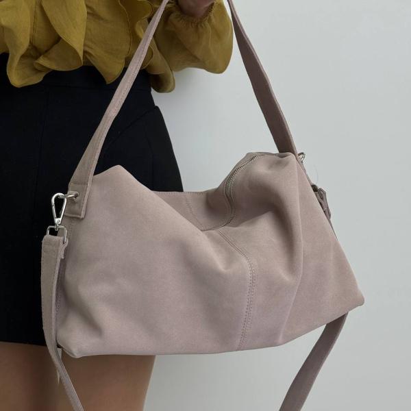 Сумочка у витонченому пудровому кольорі стане ніжним акцентом будь-якого образу — універсальна, елегантна та неймовірно приємна на дотик. Повністю виготовлена з натурального замшу, вона поєднує в собі комфорт і стиль. Усередині — два основних відділення, розділених кишенею на блискавці, а також додаткові кишені для дрібниць. У комплекті два ремені: короткий — для носіння в руці, та довгий — для плеча або через плече. Ідеальний вибір для щоденного використання та подорожей — жіноча сумка з натурального замшу, яка завжди доречна.