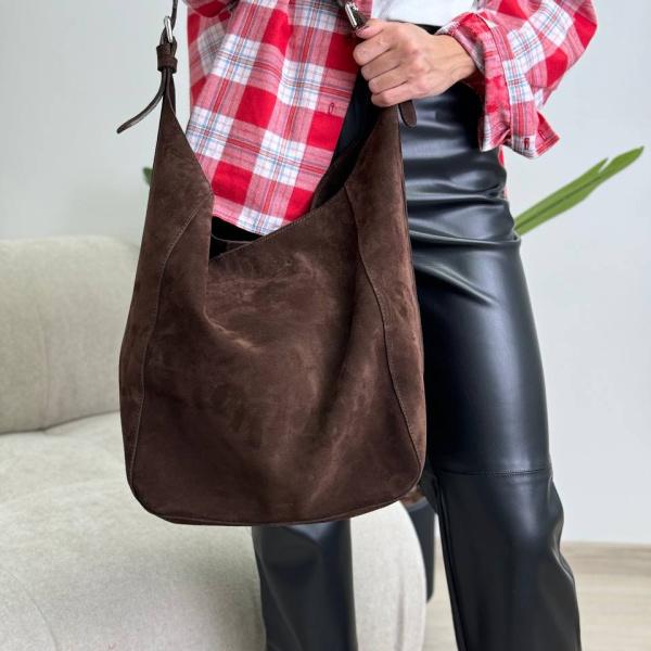 Шалено елегантна шоколадна сумочка з натуральної замші, яка помістити в собі абсолютно все. Сумка має одне велике відділення. Усередині сумки є містка кишеня на блискавці. Акуратні шви. І дуже приємна на дотик шкіра що всередині, що зовні. Закривається магнітну кнопку. Дуже зручна широка ручка у міцному закріпленні фурнітури сріблястого кольору. Сумку можна носити як у руках, так і на плечі.
