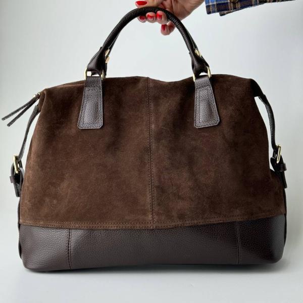 Жіноча сумочка шоколадного кольору, в шикарному поєднанні натуральної шкіри та замші. Сумка має два основних відділення, які поділяють кишеню на блискавці. Усередині є додаткові кишені на блискавці та без, а також є кишеня на блискавці ззаду. Ручки та дно сумки зроблені з натуральної шкіри, а основна частина із замшу. Низ сумки йде каркасний і на додаток є ніжки, що надає естетичного вигляду та можливість утримувати сумку не змінюючи її задуму. Фурнітура приємного сріблястого кольору. Ще сумочка дуже зручна тим, що її можна розширити за допомогою ремінців з боків сумки. У комплекті йде ще ремінь, який легко регулюється під будь-яку довжину.