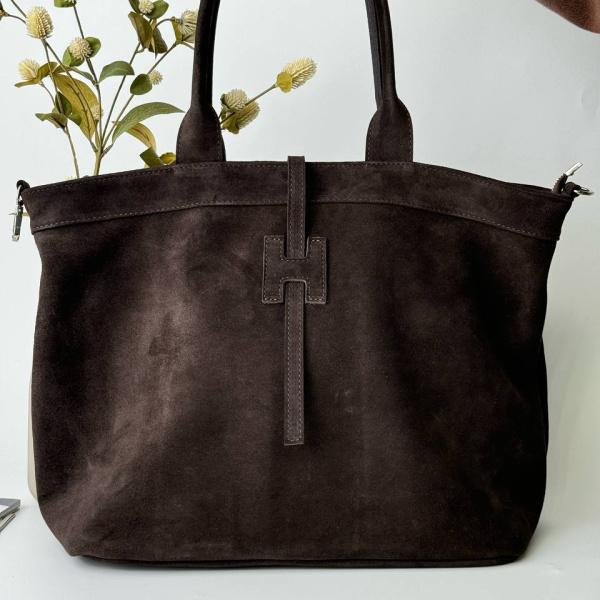 Сумочка із натуральної замші у шоколадному кольорі бездоганно доповнить ваш образ. Сумочку можна використовувати як на кожен день, так і для довгих поїздок. Усередині сумки є два основних відділення, які розділяє кишеню на блискавці. А також є кишені на блискавці та без. Повністю торба закривається на замок. Довжина ручок дозволяє носити вільно на плечі.