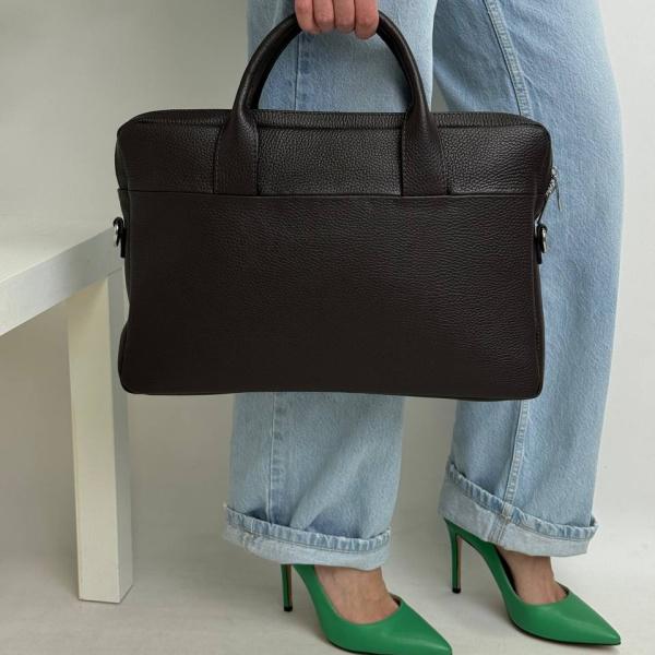 Сумка жіноча з натуральної зернистої шкіри кольору шоколад - ідеальний вибір для ділових жінок, які цінують комфорт і стиль. Модель чудово підходить для ноутбука та документів формату А4, має просторе основне відділення, що повністю закривається на блискавку. У комплекті - широкий регульований ремінь, а також зручні короткі ручки для носіння в руці. Попереду розташований додатковий шкіряний тримач, який додає практичності та стильного акценту. У нашому магазині можна купити жіночу сумку з натуральної шкіри за вигідною ціною - поєднання якості, зручності й сучасного дизайну.
