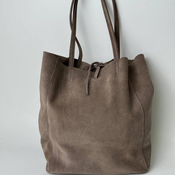 М'яка сумка жіноча з натуральної замші в кольорі тауп. Сумка має зручні ручки, тому Ви можете носити її у руці, а якщо потрібні вільні руки – її можна носити також і на плечі. Усередині сумки одне основне відділення, також є додаткова кишеня на блискавці.