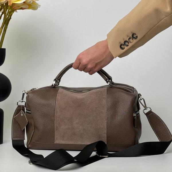 Модна модель сумки з натуральної шкіри в кольорі тауп прикрасить Ваш образ. Сумка має зручні ручки, Ви можете носити її в руці, а якщо потрібні вільні руки, в комплекті довгий ремінь, який регулюється. Всередині сумки два основних відділення та додаткові кишені на блискавці які розділяють сумку, також є додаткові кишені як внутрішні так і зовнішні.