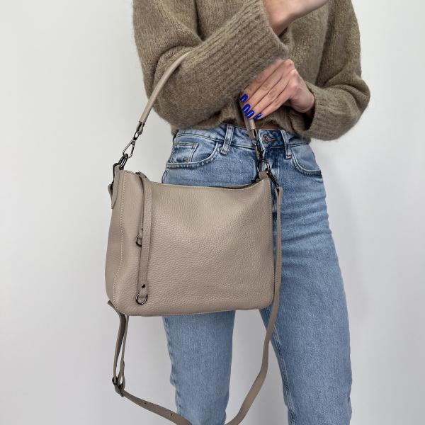 Наша новинка сумка з м'якої натуральної шкіри флотар в кольорі тауп, чудове рішення на кожен день. Всередині сумки два основних відділення, також кишеня на блискавці, дуже містка модель. Довгий ремінь у комплекті, регулюється під потрібну вам довжину, також можна носити на короткій ручці.