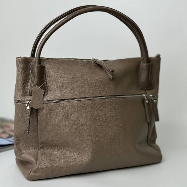 Купити жіночу сумочку з натуральної шкіри кольору тауп - чудовий варіант. Сумка має два повноцінні відділення, які розділяє кишеню на блискавці. Усередині є додаткові кишені на блискавці та без. Модель має зручні та широкі ручки. Сумочка, яка помістити у собі все.