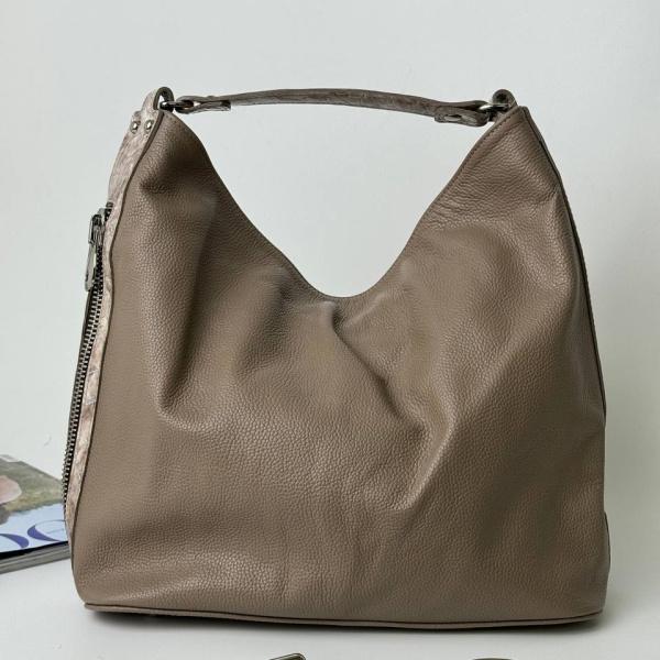 Велика жіноча сумочка із натуральної італійської шкіри ніжного кольору тауп. Усередині сумки кишеня-перегородка, яка поділяє сумку на два відділення, також усередині є додаткова кишеня на блискавці. Є дуже зручні кишені на блискавці позаду сумки, а також збоку. Фурнітура міцна та приємного сріблястого кольору. Сумочка, яку можна носити не лише за ручку, а й на плечі та через плече за допомогою додаткового ременя, що регулюється.
