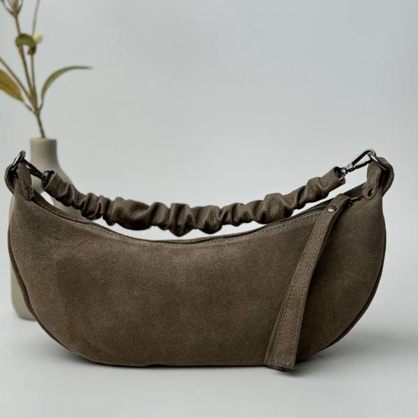 Невелика елегантна жіноча сумочка тауп кольору виконана з м'якої замші, яка надає аксесуару витончений і стильний вигляд. Зручна шкіряна ручка гармонійно доповнює загальний образ і виділяє саму сумочку. Усередині сумка має одне просторе відділення, що дозволяє зручно розмістити всі необхідні речі. Також усередині є окрема кишеня на блискавці, що дуже зручно. Сумка повністю закривається на замок, забезпечуючи збереження вмісту. Додатково в комплект входить довгий ремінь, що регулюється, що дозволяє носити її як через плече, так і в руках, роблячи модель універсальною для повсякденного життя або вечірніх виходів.