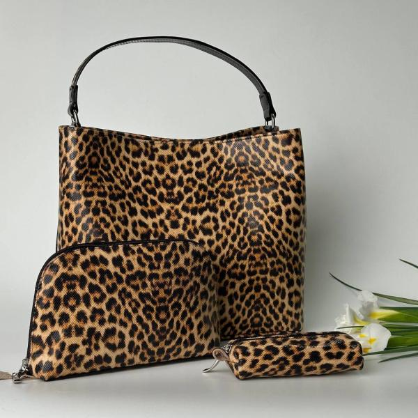 Коричневий набір з принтом: сумочка, косметичка та ключниця із натуральної шкіри. Сумочка на два відділення, кишеня на блискавці який розділяє сумку та дві додаткові кишені. Сумочку можна носити через плече, дуже зручна та стильна модель. В комплекті плечовий ремінь.