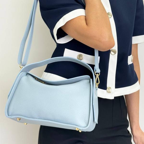 Сумочка в ніжному блакитному кольорі — стильна модель із натуральної зернистої шкіри, яка стане яскравим акцентом у вашому гардеробі. Вона має одне містке основне відділення та зручну внутрішню кишеню на блискавці для дрібниць. Закривається на блискавку та додатковий клапан для більшої зручності. Завдяки надійній ручці сумочку комфортно носити в руці, а регульований ремінь дозволяє носити її і на плечі, і через плече. Елегантності додає золота фурнітура, що вдало підкреслює дизайн моделі. Придбати цю сумочку можна в нашому магазині.