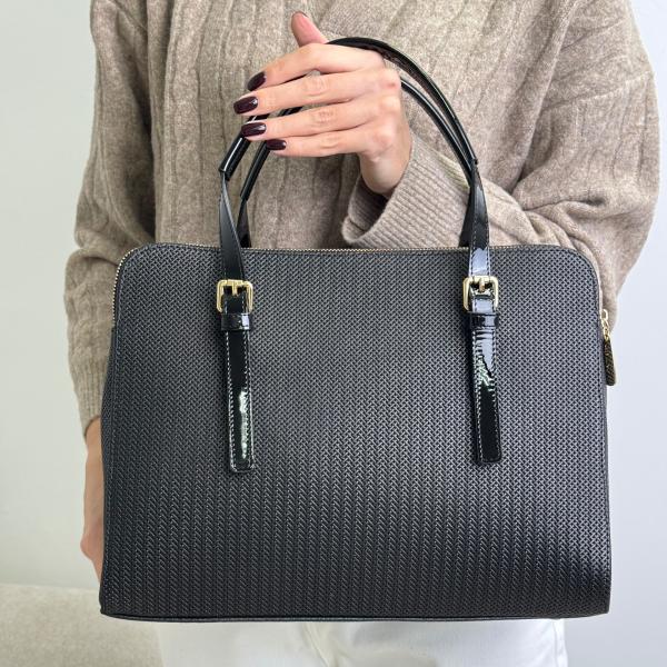 Жіноча сумочка з натуральної шкіри з перфорацією в класичному чорному кольорі — втілення елегантності та практичності. Вишукана текстура з перфорацією надає моделі сучасного вигляду, а золота фурнітура додає розкішного блиску. Усередині передбачено три окремі відділення на блискавках для зручної організації простору, а також додаткові кишені для телефону та дрібниць. Короткі ручки дозволяють носити сумочку в руці, а подовжений регульований ремінь забезпечує комфорт на плечі або через плече. Ця стильна модель стане універсальним доповненням вашого образу. Придбати сумочку можна у нашому магазині — оберіть якість і бездоганний дизайн!