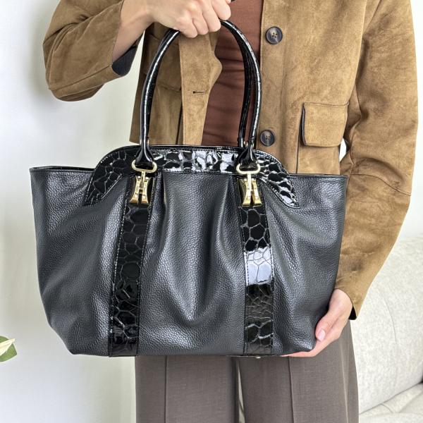 Жіноча сумочка з натуральної зернистої шкіри в елегантному чорному кольорі доповнена вставками з лакованої шкіри з перфорацією, що надають моделі вишуканого шарму. Стильний монохромний дизайн робить цю сумку універсальною для будь-якого образу. Усередині – два місткі відділення, розділені центральною кишенею на блискавці, а також додаткові кишені: одна на блискавці та одна відкритого типу для зручного зберігання необхідних дрібниць. Завдяки довгим ручкам сумку можна комфортно носити в руці або на плечі. Замовити цю лаконічну та стильну модель можна у нашому магазині — ідеальний вибір для тих, хто цінує якість та елегантність.