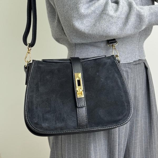 Жіноча сумочка в глибокому чорному кольорі виконана в поєднанні натуральної замші та зернистої шкіри, що надає виробу елегантності та витонченості. Модель має одне основне відділення, яке закривається клапаном із поворотним замком. Золота фурнітура додає аксесуару стильного акценту. У комплекті передбачені знімна коротка ручка та подовжений регульований ремінь для зручного носіння в руці, на плечі або через плече. Сумочка поєднує практичність і сучасний дизайн, підкреслюючи ваш образ. Придбати її можна у нашому магазині — ми пропонуємо лише якісні моделі з натуральних матеріалів для жінок, які цінують комфорт і стиль.